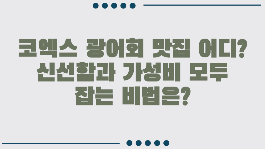코엑스에서 약속이나 행사를 마치고 맛있는 회 한 점을 떠올리고 계신가요? 특히 신선한 광어회는 많은 분들이 좋아하는 메뉴죠.하지만 코엑스 주변에는 워낙 많은 식당들이 있어 어디를 가야 할지 고민될 수 있습니다. 이 글에서는 코엑스에서 신선하고 맛있는 광어회를 즐길 수 있는 횟집 정보를 상세하게 알려드릴 테니, 여러분의 기대를 충족시킬 최고의 선택을 하시길 바랍니다. 광어회 맛집 코엑스 검색을 통해 얻을 수 있는 다양한 정보들을 꼼꼼히 살펴보고, 여러분의 취향과 상황에 맞는 곳을 찾아보세요.코엑스 광어회, 어디서 찾아볼까?코엑스 주변 상권은 워낙 활발하고 경쟁이 치열한 곳이라 횟집 또한 다양하게 분포되어 있습니다. "코엑스 횟집 추천" 키워드로 검색하면 수많은 정보가 쏟아지지만, 그중에서도 신선도와 맛, ..