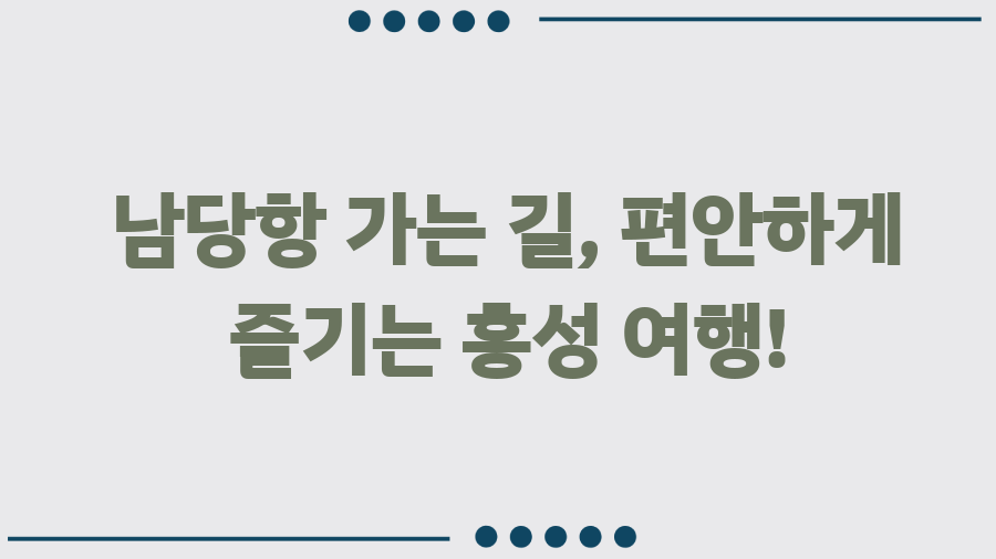 대중교통 이용 시 홍주여객, 홍성종합터미널, 광천버스터미널, 홍성역, 광천역에서 하차 후 시내버스를 이용하면 남당항에 쉽게 도착할 수 있습니다.