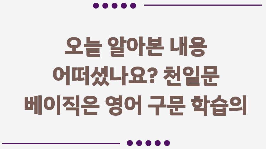 오늘 알아본 내용 어떠셨나요? 천일문 베이직은 영어 구문 학습의 든든한 동반자가 되어줄 거예요. 이 교재를 통해 여러분의 영어 실력이 한 단계 업그레이드되기를 응원합니다!