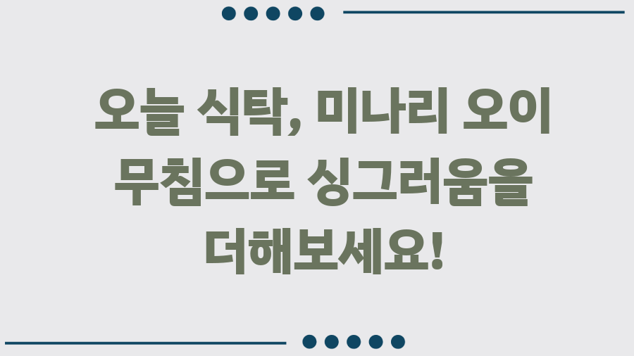 오늘은 여러분의 식탁을 더욱 풍성하게 만들어 줄 미나리 오이 무침 레시피를 속 시원하게 알려드릴게요!
