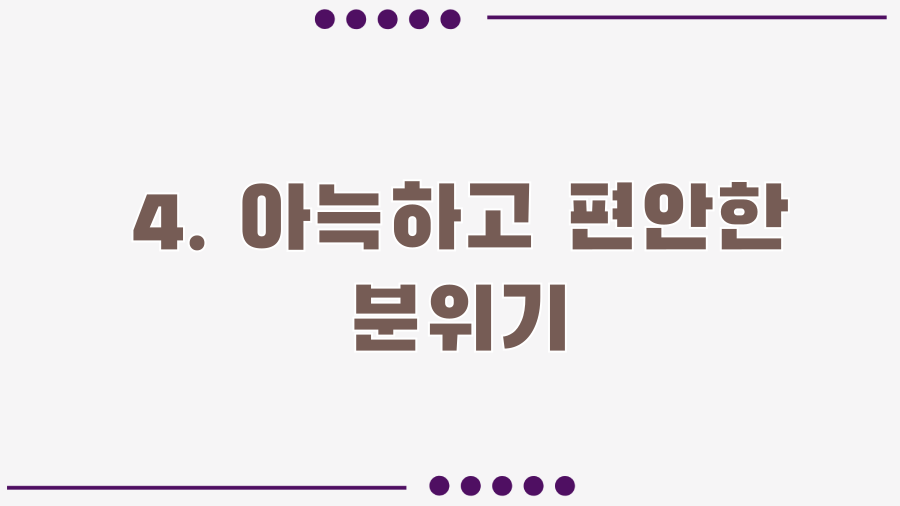 우드톤의 인테리어는 따뜻하고 안정적인 느낌을 주며, 조명 또한 은은하게 배치되어 있어 아늑한 분위기를 더합니다. 쾌적한 환경은 식사의 만족도를 높이는 중요한 요소 중 하나입니다.
