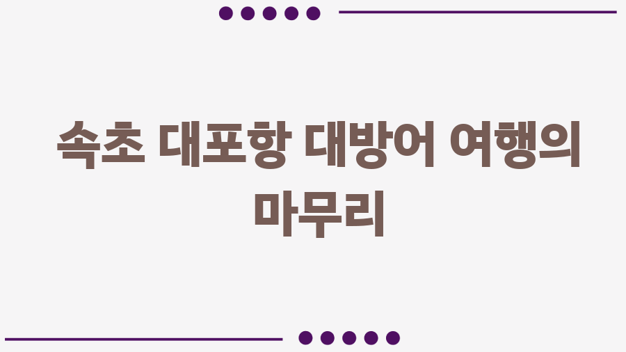 아름다운 자연 경관과 훌륭한 시설, 그리고 싱싱한 대방어까지 더해진다면, 속초 여행은 더할 나위 없이 완벽해질 것입니다. 대포항을 중심으로 다양한 즐길거리들이 풍성하게 준비되어 있으니, 겨울 여행 계획에 속초를 추가해 보세요. 겨울 바다와 맛있는 대방어, 그리고 편안한 숙소까지! 속초에서 완벽한 겨울 휴가를 보내시길 바랍니다.