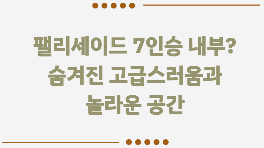 새로운 팰리세이드 7인승 모델이 출시되면서 많은 분들의 관심이 집중되고 있습니다. 대형 SUV의 웅장함은 물론, 7인승 모델 특유의 넉넉한 공간과 고급스러운 실내 디자인까지 갖췄다는 소식에 기대감이 더욱 커지고 있는데요. 과연 팰리세이드 7인승의 실내는 어떤 매력을 가지고 있을까요? 지금부터 여러분의 궁금증을 해소해 드리겠습니다!