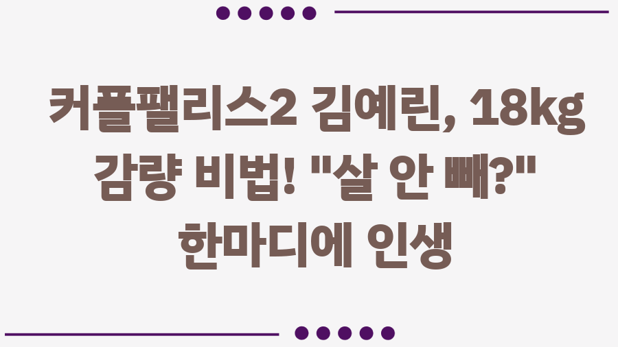 다이어트 성공 비법 대공개!커플팰리스2 김예린의 놀라운 변화 혹시 '커플팰리스'라는 프로그램을 아시나요?연애 프로그램에서 한 출연자의 따끔한 한마디가 인생을 바꾼 한 여성이 있습니다. 바로 김예린 씨인데요. 그녀가 어떻게 18kg 감량에 성공하고 '커플팰리스2'에 재출연하게 되었는지, 그 비결을 낱낱이 파헤쳐 보겠습니다. 82kg에서 64kg까지 드라마틱한 변신, 그녀에게 무슨 일이?미스코리아 대회 출전 후 체중이 82kg까지 늘었던 김예린 씨는 연애 프로그램에서 데이트 상대의 **"살 안 빼냐"**는 말에 큰 충격을 받았다고 합니다. 그 후 다이어트를 결심하고 채널A '줄여주는 비서들2'에 출연, 쥬비스다이어트의 도움을 받아 3개월 만에 14kg을 감량하며 놀라운 변화를 보여줬습니다.방송 후에도 꾸준한..