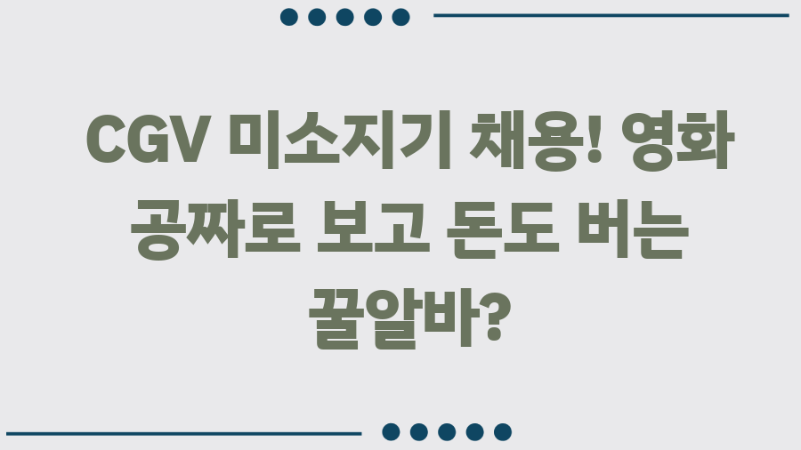 CGV 미소지기 채용, 영화관 알바의 꿈을 이루세요! 혹시 영화관에서 아르바이트하는 상상, 한 번쯤 해보셨나요? 좋아하는 영화도 보고, 팝콘 냄새 가득한 공간에서 일하는 로망! 지금 CGV에서 미소지기를 채용하고 있다는 소식입니다.다양한 지역에서 채용이 진행 중이니, 지금 바로 확인해보세요! CGV 미소지기, 지금 바로 지원하세요!CGV는 전국 각지에서 미소지기를 채용하고 있습니다. 청주터미널, 용산아이파크몰, 동탄, 강릉 등 다양한 지역에서 기회를 잡을 수 있습니다.특히 단기 미소지기 채용도 많으니, 자신의 스케줄에 맞춰 지원해보는 건 어떨까요? CGV 채용공고 목록 (2025년 3월 기준) CGV청주터미널: 미소지기 채용 (2025.03.12 - 2025.04.13)씨네드쉐프 용산아이파크몰: 미소지기..